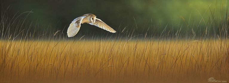 Original painting of a Barn Owl hunting over a meadow on a summer's evening - 80 x 33cm oil on stretched canvas