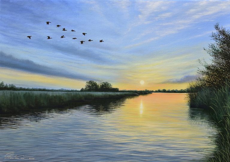 Original painting of sunset over the River Bure on teh Norfolk Broads - 20" x 14" oil on stretched canvas